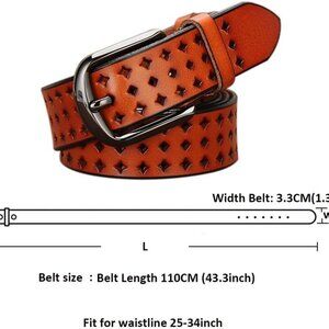 Product details Fabric type Genuine leather Care instructions Dry Cloth Clean About this item This hollow-out designer belts is made of genuine leather, soft and comfortable, perfect for daily wear and formal occasions. It is not only a perfect clothes accessory for pants but also a great decorative buckle belt to make you look more fashion. Buckle is removable, you can cut the belt to fit your size. This waist belt suit for waistline 25-34inch. Belt length is 110cm, belt width is 1.3inch; Buckle length is 5.5cm, buckle width is 4.7cm. fashion belts comes with a nice gift box, it s a good choice to give friends or family members as gift. If there is any problems with our belts. Welcome to contact us for any questions