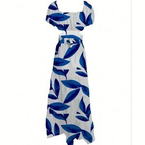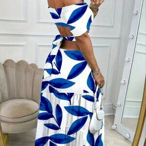 Hollow Out Off Shoulder Plant Print High Waist A-Line Dress