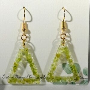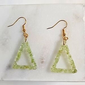 Gorgeous handmade Hollow Triangle Geometric Peridot Earrings, with peridot chips embedded in transparent epoxy