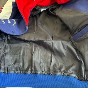Stylish Holloway varsity jacket. Blue body with white sleeves. Red hood and accents. Embroidered patches and lettering.