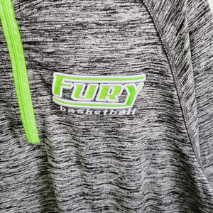 This gray sweater jersey with a fury basketball logo print is great for running or working out in the outdoors. It has a quarter zip closure for easy wear. This is pre-loved but definitely in great condition. The zipper is crisp and full functional.