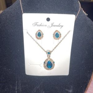 Hollowed Out Floral Pattern Waterdrop Green Necklace And Earrings Gold Tone (1)