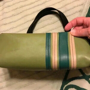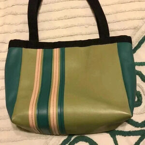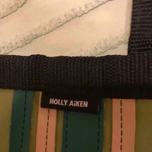 Holly Aiken vinyl tote with snap close. Measurements are 11” wide x 10” tall. Strap drop is 9”.