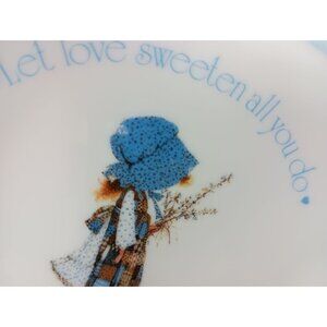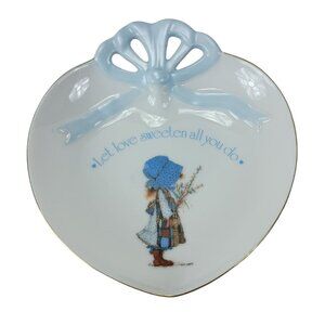 Charming and nostalgic, this vintage Holly Hobbie trinket dish features a blue girl with a heart design. Made of porcelain, this piece is in good pre-owned condition with some signs of cosmetic wear, adding to its vintage character. Perfect for collectors or as a decorative accent.