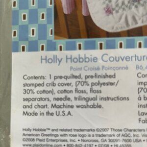 This Bucilla Hollie Hobby crib cover kit is unopened. It is pre-quilted, and needs only to be embroidered in cross stitch. Kit is complete with all floss needed for the project. Machine washable.