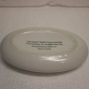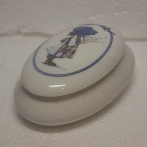 This Holly Hobbie Trinket dish copyrighted from 2002 is in good preowned condition. There is a small place on the bottom you can see in the images that looks like was done during the making of the item. the item is about 4.75 inches long. The opening is about 3.75 inches long and a little less that 2.25 inches wide. Please see images and ask any questions you may have.