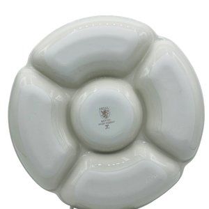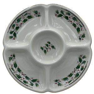 Holly Holiday by Royal Limited 5 Part Relish Divided Serving Platter. This serving dish is in excellent condition without chips, cracks, crazing or other flaws. It measures 10-3/4" wide and 1" deep. I'm downsizing my collection and have other pieces in this pattern avaialble.