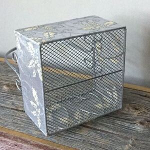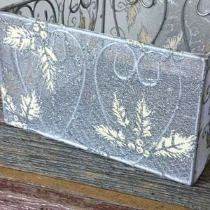 Square Xmas metal basket with scrolled handle and sheer fabric sides. Silver fabric with gold holly and ivy print. Mesh base. Approximately 6” square, 3 3/4” height without handle, and 9” with handle. Great preowned condition.