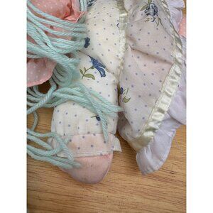 This charming handmade rag doll features a soft pink polka dot outfit, playful mint green yarn hair, and a cheerful embroidered face, standing at 15 inches tall.