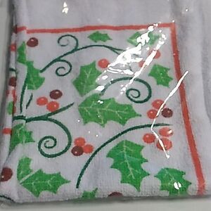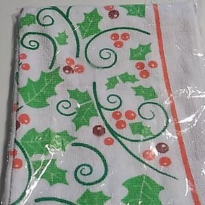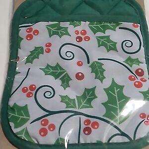 Pre-owned in new unused condition. Set of two kitchen towels and a hot pad in a festive holly pattern.