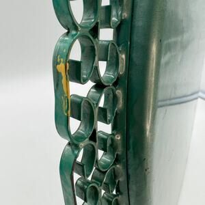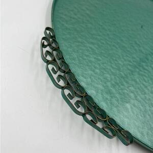 A piece of Southern California glamorous history, this vintage handmade Moire Glaze Kyes tray is composed of hammered metal with an enamel finish and double brass handles with ornate Greek key design. This beautiful piece is circular and with a beautiful green finish. Handles are firmly attached to the tray. Original label on bottom. Classic and elegant, this piece will add style to your Mid Century or Hollywood Regency or ecletic décor. Preowned item in excellent overall condition. Small scratch shown in photo.