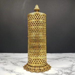 Keep your hair spray out of sight with this vintage Hollywood Regency can holder. Made with glamorous and sophisticated design, it adds a touch of charm to your vanity setup. Easily access your hair spray can while enjoying its vintage charm.