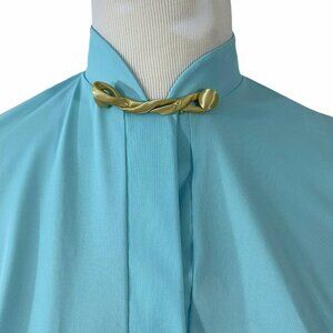 Open neckline with gold satin frog closure and stand-up collar