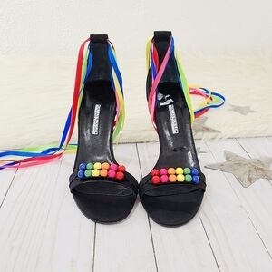 Hollywould Cucaracha open toe heels, size 9. Black satin heels with multicolored rainbow beads and ribbons that tie up your legs gladiator style. Leather soles. Made in Italy.