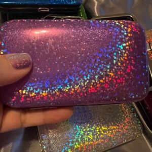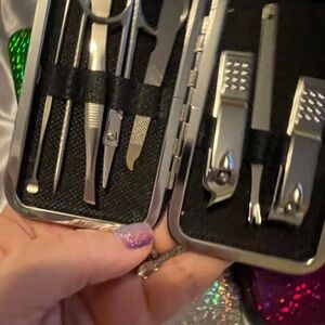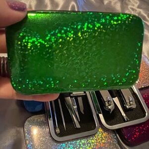 This stylish holographic manicure set features a variety of vibrant colors, perfect for on-the-go grooming. Each set includes essential tools in a compact, colorful case.