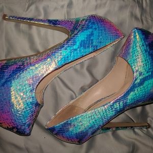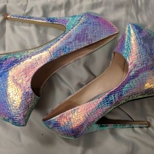 Holographic heels, holographic stiletto, laser heels, reflective pumps. Serpent python heels, reptilian, snake heels. Color shifting, multicolored, bumper shoes. Worn a small handful of times.