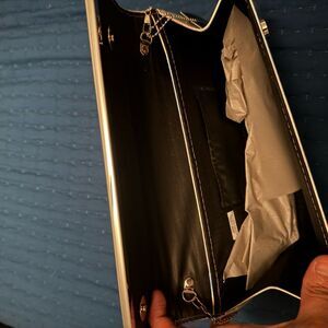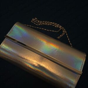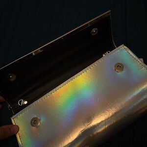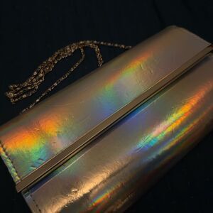 Shimmer and shine with this stunning holographic silver clutch. Perfect for a night out or special occasion.