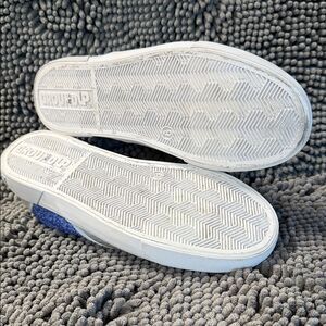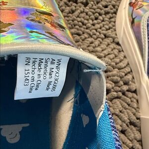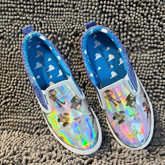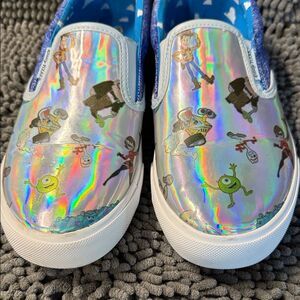Step into style with these holographic slip-on sneakers featuring playful characters. The blue and silver design adds a trendy touch, perfect for any casual outing. Excellent preowned condition