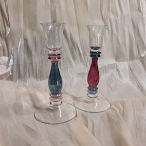 A. Set of vintage Kronos iridescent blown glass candlesticks.