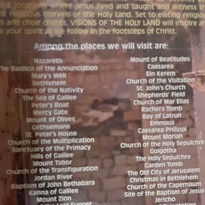 Visions Of The Holy Land VHS: Step back through the corridors of time for an inspiring journey through the birthplace of Christianity. Travel to 71 different locations where Jesus lived and taught and witness the ancient religious marvels of the HOLY LAND.Set to elating religious hymns and choir chants.