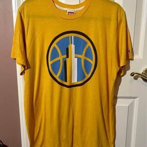 The Homage Chicago Sky WNBA T Shirt in men's size large features a crew neck and short sleeves, perfect for all seasons. Made of a comfortable blend of polyester and cotton, this yellow shirt showcases the Chicago Sky character and WNBA theme. Machine washable and with a regular fit, this unisex shirt is a stylish and practical choice for fans of the Chicago Sky.