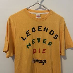 Homage Shirt Men Large Yellow Legends Never Die Graphic Tee Made USA Soft grunge