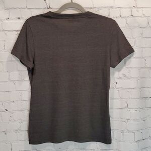 In very good used condition minor wear. Dark gray with white lettering. High scoopneck opening. Lightweight.
