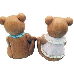 This vintage 1980s Homco bear set includes a Mama bear with an apple basket and Papa bear with a honey pot, both measuring 4 inches. Beautifully detailed and nostalgic, they add a touch of charm to any decor.