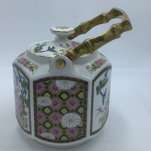 Homco Japan Asian Floral Six Sided Ceramic Tea Pot with Metal Handle