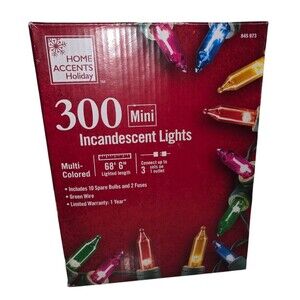 The Home Accent Holiday 300 Incandescent Lights are a festive addition to your holiday decor. With a 68' 6" lighted length and 251-300 lights shaped like bottles, this string light can be used both indoors and outdoors. The warm color temperature and candle design create a cozy and inviting atmosphere, perfect for Christmas celebrations. The green cord and wall-mounted installation add to the traditional look, while the electric-powered incandescent lights provide a bright and vibrant display. Ideal for adding a touch of holiday cheer to your home.