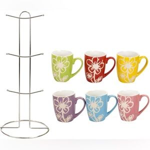 set of six ceramic mugs with a floral design.