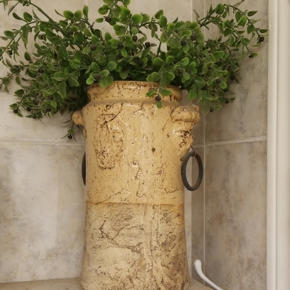 just wanted to ask again. Does it come with the pot and greenery? Everything pictured? Also, about how heavy is it. what kind of natural is the pot made of?