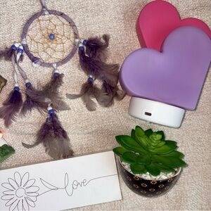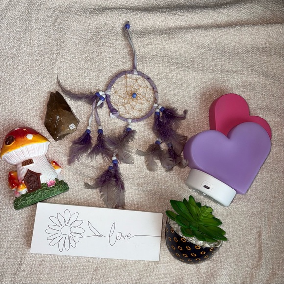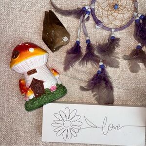 Mini home decor! Includes a crystal, dream catcher, mini mushroom, love sign, mini succulent, and a heart aroma diffuser!