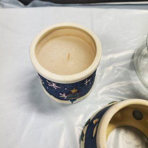 Add some festive charm to your home decor with this beautiful multicolor candle and glass shaped Christmas tree candy holder. Perfect for the holiday season and making it a great addition to your Christmas party decorations. The intricate details on the tree and the vibrant colors make it an eye-catching piece that will surely impress your guests. Both in like new condition. The candle stands 5" Tall and the candy holder is 6 1/4" Tall.