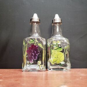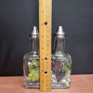 Vintage 1990's Home Essentials and Beyond hand painted grape themed Oil and Vinegar Cruet Set is in excellent condition with no chips, scratches or damage.