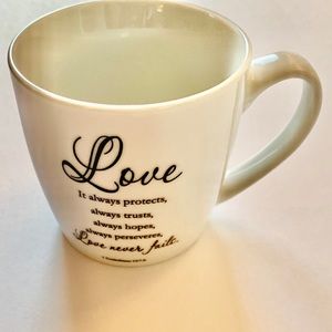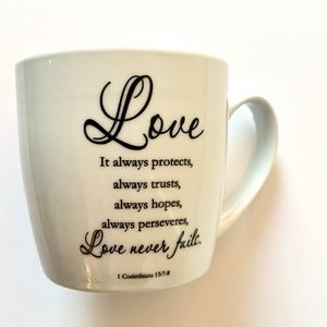 White mug wish black print: Corinthians 13:7-8 “love never fails” quote. No flaws.