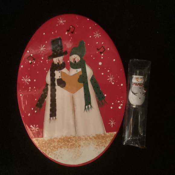 Vibrant red oval platter with a cute snowman spreader. Ideal for holiday gatherings.