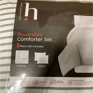 The look and feel of soft chambray, this cationic dyed reversible stripe comforter can be dressed up or mixed with soft casual accents. The muted stripe adds a soft design to the room that complements pop colors you may want to play with as accent pieces. Reversibility allows you to easily keep the look of your bedding updated and fresh. Intellifresh™ brand built in odor protection powered by SILVADUR antimicrobial technology keeps bedding fresher longer Includes a comforter and shams.