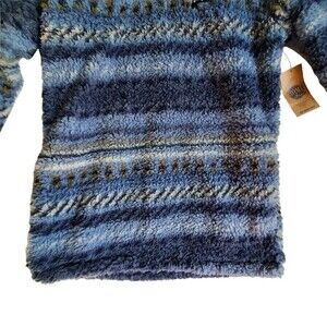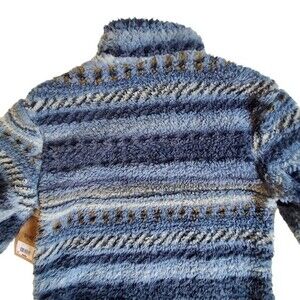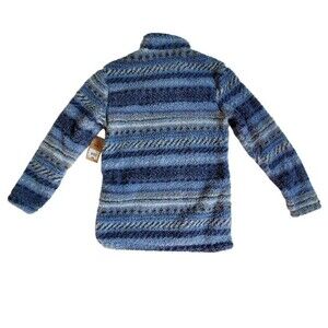 Brand: Home Free. Occasion: Casual. Winter. Size Type: Regular. Size (Women's): S. Material: 100% polyester. Neckline: 1/4 zip. Style: Sherpa pullover. Sleeve Length: Long sleeve. Color: Blue. Pattern: Striped. Features: Multi-color shades of blue stripes. 1/4 zip. State of Alabama emblem on the chest. Soft, plushy, cozy, and warm!