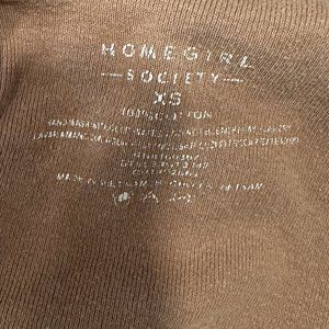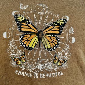 Home Girl Society Size XS Brown Cropped Top with Lattice Strappy Back and Front Butterfly Graphics CHANGE IS BEAUTIFUL ~ Cap Sleeves ~ 100% Cotton ~ Good Pre-Owned Condition ~ Tiny White Spot on Back ~ See Photos ~ From a Smoke-Free Home