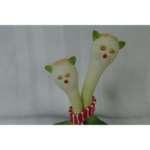 Bring some quirkiness into your home decor with this charming Enesco Green Onion Scallion Cats figurine. This collectible piece is perfect for cat lovers and enthusiasts of unique decor. The figurine features two playful feline characters creating an eye-catching and fun display. Figurine is in good pre-owned condition w/ no chips or cracks noted.