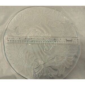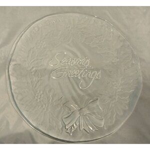 Vintage Clear Glass Holiday Plate With Embossed Seasons Greetings Design & Wreath Motif