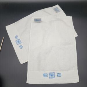 HOME SPA Portugal 100% cotton bathroom hand towels in crisp white with blue embroidered bath icons along the hem. Each towel measures approximately 16" x 11" and is soft, absorbent, and durable.