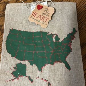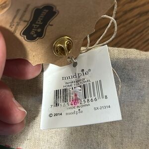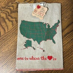 Mud Pie Home Is Where The Heart Is Linen Tea Towel NWT. 18” X 12” 100% linen tea towel. USA outline map with movable red heart lapel pin. Such a cute gift for a housewarming, a college student, a friend moving away or yourself! Never used