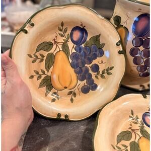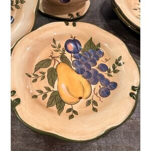 VINTAGE HOME TRENDS “FRUIT HARVEST” STONEWARE SET – HAND-PAINTED FRUIT DESIGN WITH GREEN RIM.