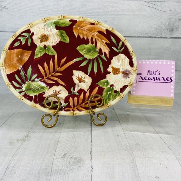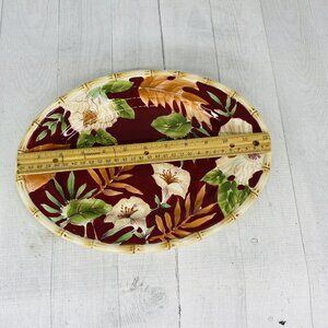 Home Trends HIBISCUS Bamboo Edge Ferns Floral Red Oval Ceramic Serving Platter