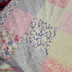 A symphony of comfort and style, this charming quilt features a delightful patchwork design with an array of floral prints and striped patterns. The quilt's intricate stitching enhances its durability and adds a touch of homespun elegance. The reverse side offers a smooth, quilted texture, providing an extra layer of warmth and coziness. Its soft, inviting colors create a serene and welcoming atmosphere in any bedroom. 104 x 96 inches.