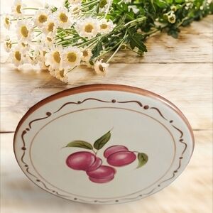 Home ceramic tile trivet plate hot pan pot holder set of 2 with dark wheat color trim with burgundy plum design in great condition from smoke and pet free home.0642
