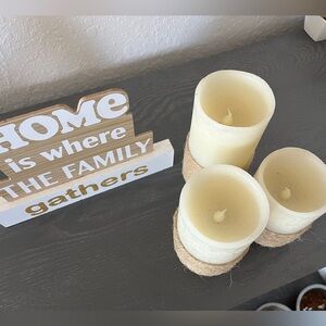 Candles and decorative sign bundle. Candles light up work with triple aaa batteries. Not included.
