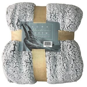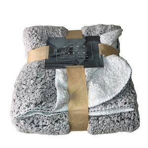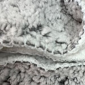 Super soft and fuzzy Sherpa throw for chilly nights or staying cozy with morning coffee. The blanket is gray with white cream color. The root of the thread is darker and and lightens towards the ends the individual threads.